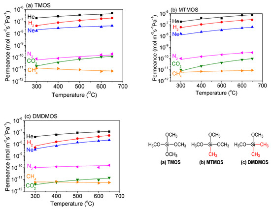 Temperature dependence of the permeance for several gas species through (a) TMOS-, (b) MTMOS-, and (c) DMDMOS-derived membranes. Lines represent the fitted results.