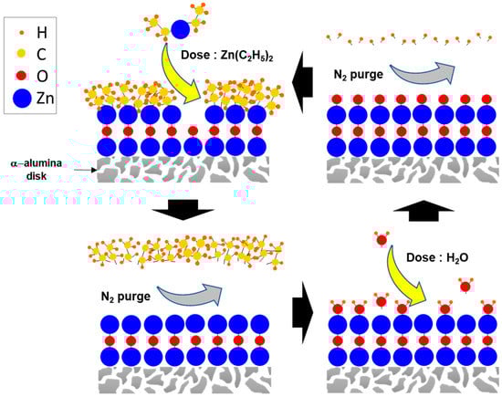 A thin layer of ZnO was coated on the α-alumina membranes (1 in. diameter, 1 mm thickness, ~200 nm pore size, and ~25% porosity from Coorstek) by ALD. The ZnO film was formed through the following mechanism []: