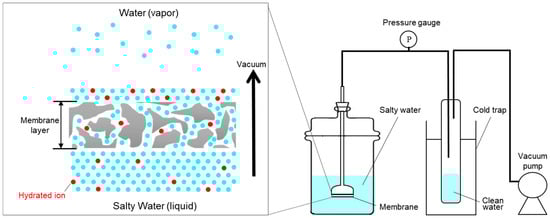 MD has also been a widespread approach for purification of salty water which uses membranes having pore size ranging from 0.1 to 1 µm and the membrane is not wetted by process liquids []. Garofolo et al. used MFI-type zeolite membranes for desalination. With water permeation tests, the membranes showed water permeance of ~42.8 L m−2 h−1 bar−1 and ion rejection above 99% []. Eykens et al. deposited hydrophobic coating (Hyflon AD80×) on a commercial hydrophilic membrane with a microporous structure. The membrane showed water flux of 16 L m−2 h−1 and ion rejection above 99.5% []. Leaper et al. fabricated PVDF mixed matrix membranes by incorporating graphene oxide functionalized with 3-(aminopropyl) triethoxysilane (APTS) into PVDF polymer solutions. Successful functionalization of GO with APTS was confirmed with XPS and FTIR. Addition of GO and GO-APTS enhanced the membrane flux by 52 and 86%, respectively. The best performing membrane contained 0.3 wt% GO-APTS and showed water flux of 6.2 L m−2 h−1 []. Bush et al. used pH adjustment as a technique to reduce silica scaling on a hydrophobic polypropylene membrane for desalination. For feed pH less than 5 or higher than 11, silica scaling became negligible to 6000 mg/L of silica concentration. Water flux of 11 L m−2 h−1 and salt rejection of 99.9% was obtained [].