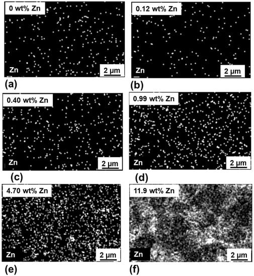 EDX elemental mapping of (a) the pristine membrane and ZnO ALD membrane with (b) 8, (c) 16, (d) 32, (e) 64, and (f) 128 ALD cycles, respectively.