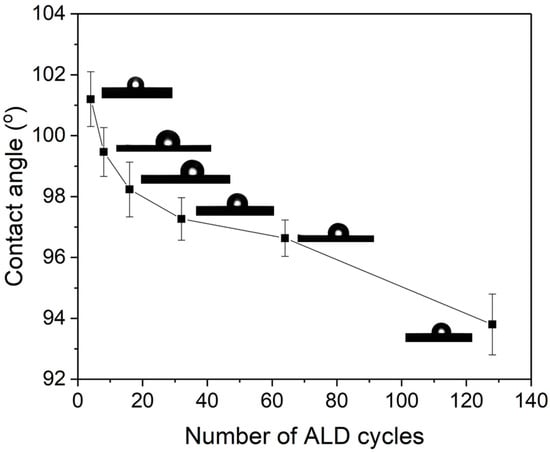 With increasing the number of ZnO ALD cycles, the membranes are expected to have increased affinity for water. In Figure 6, the hydrophilicity of the membranes before and after ZnO ALD was determined by measuring the water contact angle (CA) []. It was observed that the water CA continuously decreased from 101.2° to 93.8° as the number of ZnO ALD increased from 4 to 128, which indicated that ZnO ALD led to a progressively increased hydrophilicity of the membranes [,,]. Hurwitz et al. investigated the impact of electrolyte pH, ionic strength and ionic concentration on surface acid-base functionality, wettability, and hydrophilicity. For buffered and unbuffered solutions water contact angle decreases from 61° to 42° and 72° to 46°, respectively, when the pH was increased from 2 to 12, which illustrates the increase in hydrophilicity with pH []. Ponsonnet et al. studied surface hydrophilicity, surface free energy, interfacial free energy and surface roughness for substratum surface. For titanium-nickel surface water contact angle decreased from 73° to 66° within initial 20 s which showed the increase in hydrophilicity [].