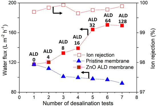 Atomic layer deposition (ALD) process is a chemical vapor deposition process that is based upon surface limiting chemical reactions between precursors and a substrate. ALD method is suitable for depositing film with controllable thickness even at sub-nanometer scale []. It operates on alternating, self-limiting chemical reactions between gaseous precursors and a solid surface to deposit thin films in a layer-by-layer fashion []. Because the self-terminating surface reactions along with gaseous diffusion of precursor molecules induce conformal and uniform coating, ALD is well suited for catalyst synthesis and surface fabrications [,,]. ALD with metal oxides like ZnO and Al2O3 has shown to increase the hydrophilicity of the membrane surface, which makes ALD useful for water desalination purpose [,,,]. Alam et al. grew TiO2 ALD on polyethersulphone (PES) membrane. It was shown that the TiO2-film-deposited PES membrane exhibited >90% NaCl rejection (4 times higher than uncoated membranes) in a pressurized desalination at feed pressure of 8 atm and room temperature. However, deposition of TiO2 resulted in marginal decrease in water flux from 60 to 47 L m−2 h−1 because of pore size reduction caused by nanolayer deposition []. Song et al. used molecular layer deposition (MLD) as a novel and highly controllable method to prepare TiO2 nanofiltration membranes with ~1 nm pore size for water purification. Membrane pore sizes were controlled by number of deposition cycles and precursor species. Optimized TiO2 nanofiltration membrane had water permeability of ~40 L m2 h−1 bar−1 for pressurized desalination. Membrane showed moderate rejection for Na2SO4 (43%), and MgSO4 (35%) and high rejection of methylene blue (96%) [].