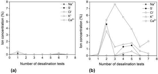 Experiments were performed to investigate the effect of ultrasonic cleaning on membrane fouling, which is the major limitation in all membrane operations. To investigate the cleaning process, two pristine membranes were used for desalination experiments at the same conditions. After each cycle of desalination experiments, only one of the membranes was cleaned. After each step of desalination experiment, the membrane was detached from a bell-shaped glass tube. The tested membrane was calcined in stagnant air at 550 °C for 3.5 h to remove the remaining epoxy adhesive. The calcined membrane was immersed in an ultrasonication bath at room temperature for 30 min. Ultrasonic membrane cleaning uses high-frequency sound waves to agitate the aqueous solution which further acts on retained ion inside tortuous pores of the membrane surface. It was reported that sonication increased the cleaning efficiency by 5–10% []. After desalination experiments, cleaned and uncleaned membranes were analyzed with EDX in order to measure the retained ion concentrations on the surface and cross-section of the membranes. Figure 8a,b shows the results of EDX analysis of the membrane surface (feed side). The cleaned membrane showed much lower concentration of retained ion concentration (0.01–0.03%) compared to that of the uncleaned membrane (3–8%).