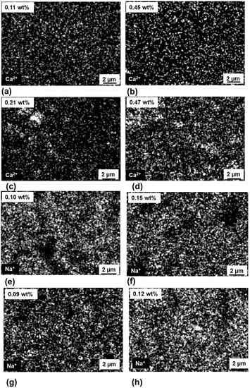 EDX elemental mapping (Figure 9a–d) showed that Ca2+ ion had lower ion concentration for cleaned membranes than for uncleaned membranes. Ca2+ ion concentration had a relatively small value of ~0.11 wt% for the membrane feed side. For the uncleaned membranes, the amount of salts on the surface got accumulated and the concentration of retained ion was higher (0.45 wt%) for the membrane feed side. It was found that cleaning process between desalination experiments helped in removing the ions retained on the membrane surface and inside the tortuous pore channels. Figure 9e–h also demonstrated that Na+ ion showed slightly higher concentration for the uncleaned membrane (0.15 wt% for membrane side) than for cleaned membrane (0.10 wt% for membrane side). The concentration was slightly higher for Ca2+ when compared to Na+. This can be explained by the higher hydrated ion radius of the Ca2+(0.41 nm) in comparison to Na+ (0.36 nm), which allowed more retention of Ca2+ ions in the tortuous pores and thus more concentration of Ca2+ in comparison to Na+ [,].