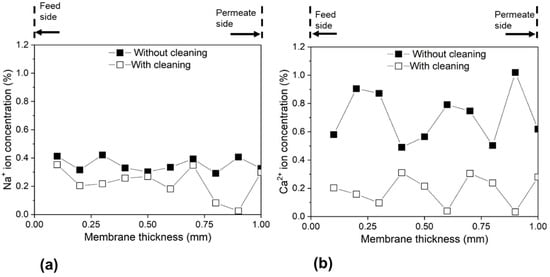Ion concentration profiles along the membrane cross-section after seven desalination experiments with and without cleaning process: (a) Na+ and (b) Ca2+ ion.