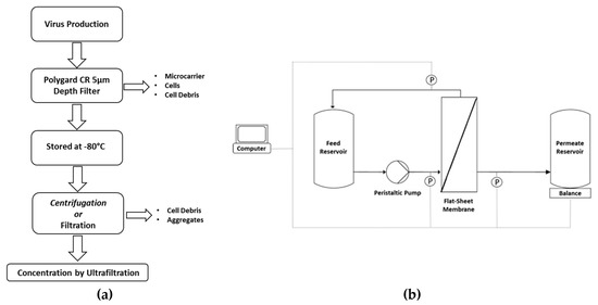 - Wickramasinghe, S.R.; Kalbfuss, B.; Zimmermann, A.; Thom, V.; Reichl, U. Tangential flow microfiltration and ultrafiltration for human influenza A virus concentration and purification. Biotechnol. Bioeng. 2005, 92, 199–208. [Google Scholar] [CrossRef] [PubMed]