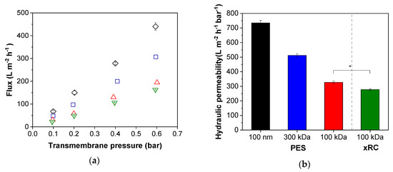 Comparison of membrane performance. (a) Changes in flux according to the transmembrane pressure (black = 100 nm, blue = 300 kDa, red = 100 kDa polyether sulfone (PES), green = 100 kDa cross-linked regenerated cellulose (xRC)). (b) Hydraulic permeability of the membranes. In each panel, the values are means ± standard deviations (n = 3). Significant differences were observed between the 100-kDa xRC membrane and all other membranes, but for clarity we only represent the difference between the two 100-kDa membranes (* p < 0.05).