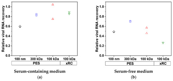 Recovery of total viral RNA from (a) SCM and (b) SFM. The greatest loss of total virus RNA in SCM was ~40%, as observed for the 100-nm membrane (black), whereas the other membranes showed losses of ~20%. When the MV was produced in SFM, the minimum loss was ~30%, as observed for the 300-kDa membrane (blue). The 100-nm and 100-kDa PES membranes (black and red, respectively) showed similar losses of ~50%. The xRC membrane (green) showed much higher losses than the PES membranes (~75%). The experiments were conducted in duplicate (n = 2), and each result is presented as a single data point.