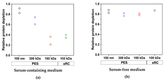 The relative clearance of total proteins by each membrane in (a) SCM and (b) SFM for an MV concentration factor of 15. The experiments were conducted in duplicate, and each experiment is presented as an independent data point (n = 2).