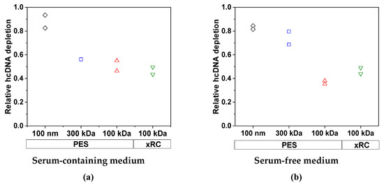 The clearance of host cell DNA by each membrane in (a) SCM and (b) SFM for an MV concentration factor of 15. The experiments were conducted in duplicate (n = 2), and each experiment is presented as an independent data point.