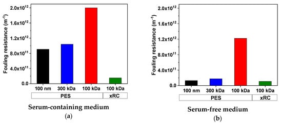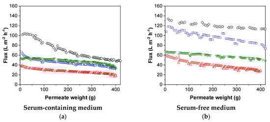 For initial characterization, we determined the TMP-dependent pure water flux of each membrane. The water flux and thus the hydraulic permeability decreased for PES membranes with lower MWCO values (Figure 2). The comparison of the different membrane materials revealed a slightly lower TMP-dependent increase in the pure water flux and therefore a higher membrane resistance (Equation (1)) for the xRC membrane. If we consider the pure water flux experiments alone, we would choose the PES membrane with a pore size of 100 nm because this achieved the highest hydraulic permeability. However, the pure water flux does not necessarily predict a membrane’s performance when filtering the cell culture supernatant to recover infectious MV particles.