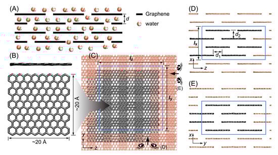 - Willcox, J.A.L.; Kim, H.J. Molecular Dynamics Study of Water Flow across Multiple Layers of Pristine, Oxidized, and Mixed Regions of Graphene Oxide: Effect of Graphene Oxide Layer-to-Layer Distance. J. Phys. Chem. C 2017, 121, 23659–23668. [Google Scholar] [CrossRef]