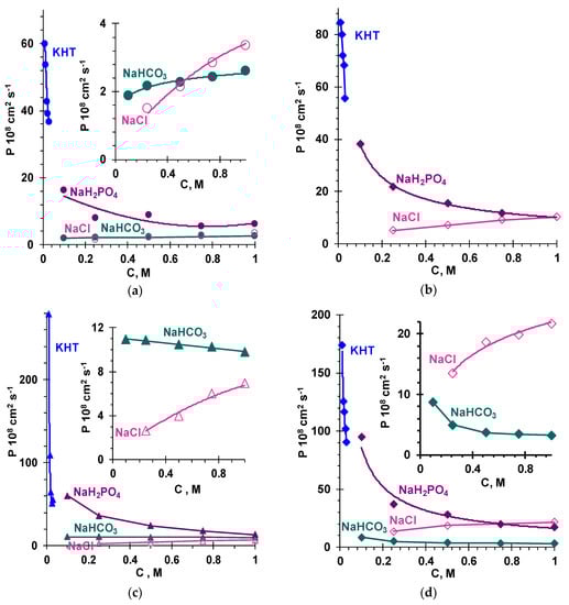 Indeed, with dilution of the external solution, the highest increase in the diffusion permeability of the membranes was observed in the case of KHT (Figure 1). At the same time, the values of P in the range of dilute solutions were higher in the case of NaH2PO4 than in the case of NaHCO3, for which our theoretical estimates predicted a higher concentration of doubly charged counterions in the gel phase. The reason for the decrease in the diffusion permeability of the AEM in diluted NaHCO3 solution, apparently, was the alkalinity of the AEM internal solution (Figure 2). High pH values of the internal solution lead to deprotonation of secondary and tertiary amines, i.e., to a partial loss of the ion-exchange capacity of the membranes []. The Donnan exclusion of protons, which depends on the concentration of fixed groups, is weakened [] and, consequently, the molar fraction of strongly hydrated, doubly charged CO32− anions is smaller than in calculations that do not take this phenomenon into account. It is known from the literature [,] that the content of weakly basic groups in the studied membranes is noticeable. This is evidenced, e.g., by the higher water splitting rate of these commercial membranes compared with the experimental membranes that contain only quaternary ammonium ions []. In the case of NaH2PO4 or KHT solution, the pH of the internal solution of AEM remained acidic or close to neutral in the studied range of concentrations. Thus, the ion-exchange capacity of membranes in such solutions was higher than membranes in the NaHCO3 solution.