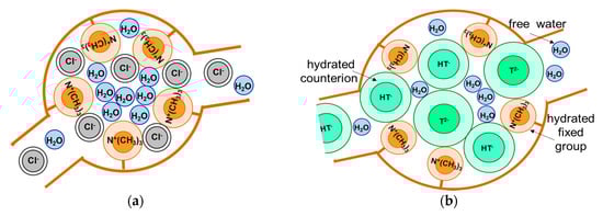Schematic representation of the effect of hydration degree of (a) weakly hydrated (b) and strongly hydrated counterions on the size of pores and distribution of free and bound water in them.