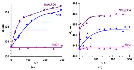 An indirect evidence of the described effect was the increase in the membrane thickness, d, after transferring the AEM from the 0.02 M NaCl solution to KHT and NaH2PO4 solutions of the same concentration (Figure 5).