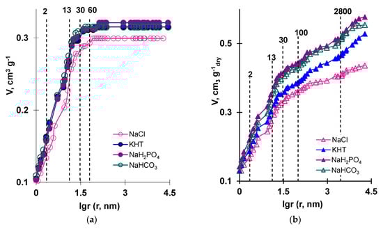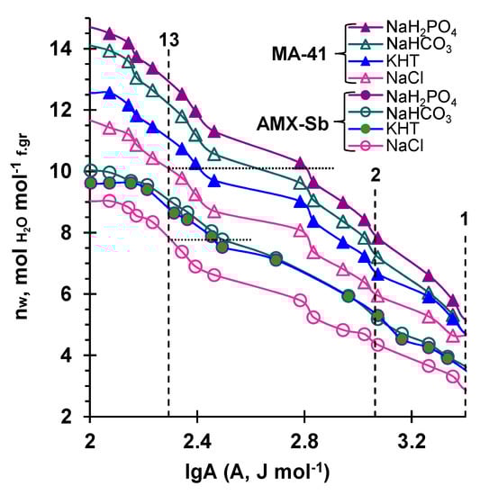 A comparison of binding energies of water at a given nw in pores whose effective radii did not exceed 13 nm (dotted lines parallel to the abscissa in Figure 7) provided the information discussed in detail below. In the case of AMX-Sb and NaCl, the number of moles of water per one fixed group was 7.76, A = 197 J mol−1. At the same value of nw, the binding energy of water in other electrolytes increased to about 290 J mol−1. In the case of MA-41 and NaCl, nw = 10.15, A = 197 J mol−1. At the same value of nw, the water binding energies became equal to 250 J mol–1 (KHT), 400 J mol−1 (NaHCO3), and 650 J mol−1 (NaH2PO4), i.e., the values of A increased in the sequence: NaCl < KHT < NaHCO3 < NaH2PO4. It can be assumed that the amount of bound water in micro- and meso-pores, whose presence contributes to the stretching of the ion-exchange matrix of membranes, also increased in the same sequence. This sequence was very similar to the sequence of the Gibbs hydration energy growth: << ≈ < , (Table 3), though it was not identical. Apparently, the swelling of the MA-41 membrane in the NaHCO3 solution was less than expected due to the phenomenon already discussed in Section 3.2.1. The alkaline medium of the internal solution of the AEM led to the decrease in the ion-exchange capacity of the membranes. As a result, the electrostatic repulsive forces between adjacent fixed AEM groups decreased, and the stretching of the elastic ion-exchange matrix were reduced compared to the case of KHT and NaH2PO4 solutions, in which the gel phase have acidic or close to neutral pH values.