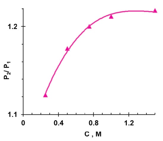 The concentration dependence of the ratio of diffusion permeability of the MA-41 membrane after being in NaH2PO4 (P2) and NaCl (P1) solutions for about 150 h. Data obtained in the NaCl solution.