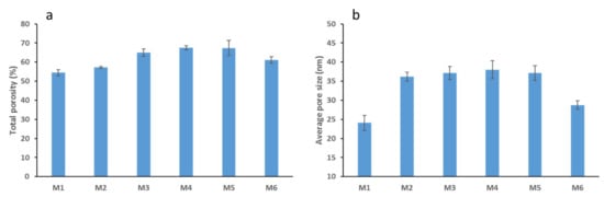 Average values for total porosity (a) and average pore size for PS membranes (b).