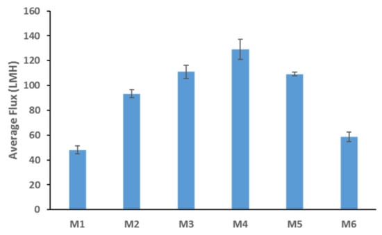 Figure 3 shows the DW fluxes for the fabricated membranes. The clear trend seen here is similar to the total porosity trend depicted in Figure 2a; where a general increase is followed by a decrease in the flux values. This could be expected since total membrane porosity and pore size are the main parameters affecting membrane flux [46]. M4 samples possessed the highest porosity and pore size values (see Figure 2), while also exhibiting the highest flux readings (see Figure 3). The addition of AG clearly enhances membrane flux (over 100% increase from neat M1 samples to M4 samples). Flux enhancement due to hydrophilic additives has been widely reported in the literature [30,43,45,47,48]. The improvement in flux readings for the PS/AG membranes can be explained by two main reasons. Firstly, the increase in total porosity and interconnectivity of channels present in PS/AG membranes (as evidenced by the FESEM images in Figure 1) lead to better transport of water throughout the membrane. Secondly, the enlargement of sponge-like macrovoid structures seen in the AG-containing membranes observed in the cross-section FESEM images in Figure 1 add to the enhanced transport of water through the basal membrane layer.