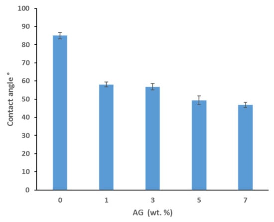 Water contact angle measurements were taken in order to evaluate the hydrophilicity of the synthesized membranes. Figure 4 displays the results for the average water contact angles for selected PS membranes with various AG loadings. Smaller water contact angle values indicate higher hydrophilicity and hence wettability of the membranes, whereas larger values indicate more hydrophobic surfaces. A clear trend is seen where the membrane hydrophilicity increases as the AG loading increases, with a 45% decrease in contact angle at the highest AG loading (7 wt.% AG) compared to the bare PS membrane. These findings are consistent with a previous study which yielded results with a similar trend [31]. The hydrophilic nature of AG’s polysaccharide subunits provides a logical explanation for the observable pattern. It could be assumed that the higher loadings of AG in the cast solutions allow for a greater abundance of the hydrophilic side chains which orientate themselves towards the membrane surface during membrane casting, where the boundary with water molecules is found [31]. The addition of other hydrophilic additives, with known pore forming capabilities similarly confer membrane surfaces with increased wettability as indicated by the smaller contact angle values reported [49,50].