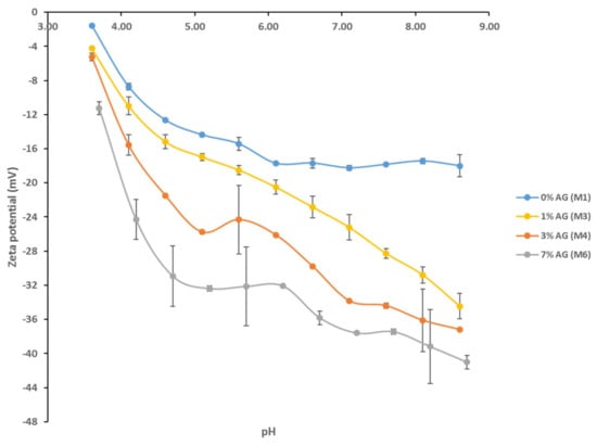 Zeta potential values of PS/AG membranes at different pH.