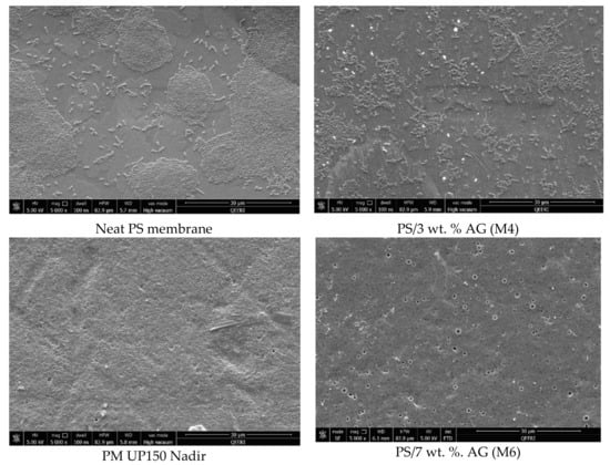 Figure 1 shows the surface and cross sectional FESEM images for selected membrane samples. The surface images show a clear difference in morphology, where an abundance of pores is seen at higher AG (wt. %) loadings compared to neat PS membrane samples. Importantly, no defects were visible at the membrane surface in line with other studies which reported similar findings upon addition of AG [31] or other additives such as PVP [39] to the casting solutions. Several studies have reported that AG addition leads to changes in the porous structures of the cast membranes [30,31]. The cross sectional FESEM images of the membrane samples further validate the above findings. An increase in finger like downward projections from the thin surface layer is noticeable. Larger and more numerous macrovoids are seen in the membrane samples at higher AG loadings. These outcomes can be explained by understanding AG’s role in pore formation. Owing to the fact that AG is an amphiphilic substance due to the presence of both neutral and acidic monosaccharides, these residues confer hydrophilic properties. The presence of hydrophilic AG induces higher thermodynamic instability in the doping solution [39,40]. This ultimately leads to faster demixing between the solvent and non-solvent in the coagulation bath. This instantaneous demixing results in membrane surfaces possessing numerous pores and wider macrovoids in the sponge like matrix below [41].