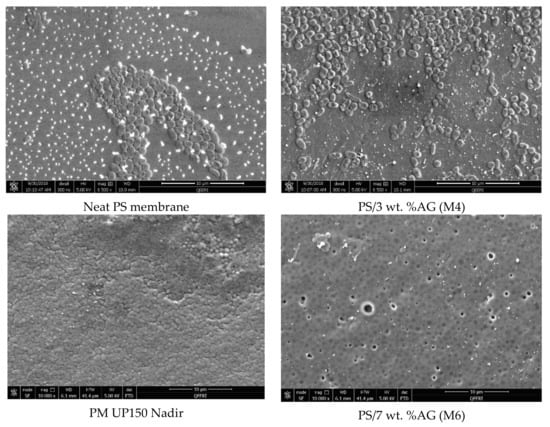 The calculated average pore size for all the fabricated membranes increases from 24 nm for the neat PS membrane (M1) to 39 nm for M4 (3 wt. % AG) samples and then decreases to 28 nm for M6 samples which contained the highest loading (7 wt. %) of AG (Figure 2b). The initial increase in average pore size observed can be attributed to AG’s ability to speed up the demixing process described above due to AG’s hydrophilic nature. Several studies have reported that the membrane pore size decreases at maximum loading of nanofiller [30,31,43,45] because of formation of less porous membrane structure at such casting conditions.
