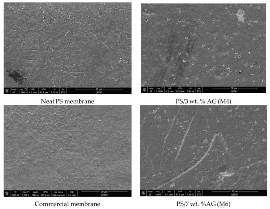 From the SEM analysis, it was observed that the surfaces of the commercial membranes were covered with a layer of bacterial cells for all the strains tested (see Figure 6, Figure 7, Figure 8 and Figure 9). However, all the membranes that incorporated AG showed a significant decrease in bacterial colonization, as seen by the SEM images. Interestingly, the membrane that showed the greatest inhibition was PS membrane with 7 wt. % AG loading (M6), followed closely by M4 sample (3 wt. % AG) (see Figure 6, Figure 7, Figure 8 and Figure 9).