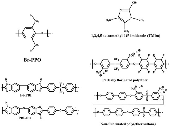 All chemicals were used as received without further purification. Poly(2,6-dimethyl-1,4-phenylene oxide) (PPO) was purchased from Sigma Aldrich and Bromination of PPO was conducted as described in literature [20]. Poly[(1-(4,4′-diphenylether)-5-oxybenzimidazole)-benzimidazole] (PBI-OO) was obtained from FuMA-Tech GmbH, Germany. Fluorinated PBI (F6-PBI) was purchased from Yanjin Technology, Shenzhen, China. The sulfonated polymers were prepared as previously described in the literature [21]. 1,2,4,5-Tetramethylimidazole (TMIm) was purchased from TCI Chemicals. N,N-Dimethylacetamide (DMAc) and methanol were purchased from VWR International GmbH, Bruchsal, Germany. Potassium carbonate was purchased from ABCR GmbH, Karlsruhe, Germany. Sulfuric acid, potassium hydroxide, 0.1 N standard hydrochloric acid, sodium chloride and sodium hydroxide were purchased from Carl Roth GmbH, Karlsruhe, Germany. The vanadium electrolyte solution (1.6 M vanadium in 30% sulfuric acid: 50% VO2+ and 50% V3+), was provided by RIVA GmbH Batteries, Backnang, Germany. The structures of the polymers components used in this study are presented in Figure 1. Reference membranes Nafion®212 (N212) and Fumasep®FAP-450 (FAP 450) were supplied by Ion Power GmbH (München, Germany) and Fumatech GmbH (Ludwigsburg, Germany), respectively.