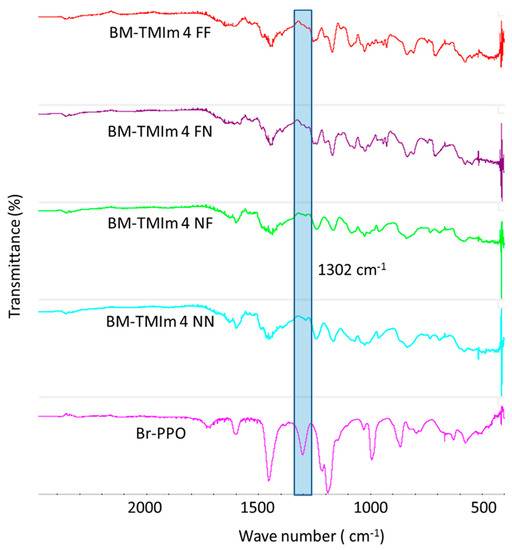 To confirm the possible binding of the bromomethyl groups from Br-PPO to the TMIm or PBI, a structural analysis was performed by FT-IR (Figure 3). The strong peak observed at 1302 cm−1 can be assigned to a stretching vibration of the CH2-Br groups of Br-PPO, which was not observed in the polymers of any of the blend membranes indicating that all CH2-Br groups have completely reacted either with TMIm for quaternization or PBI for formation of covalent bonds [18].
