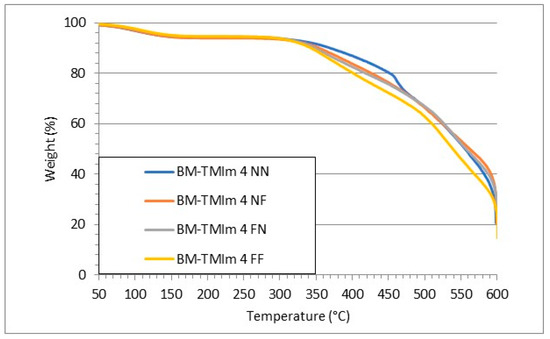 To investigate the thermal stability of AEBMs, thermal gravimetric analysis (TGA) was conducted (Figure 4). The first weight loss step (up to 200 °C) is attributed to water evaporation. The second weight loss step starting at approximately 300 °C can be assigned to the splitting-off of the imidazolium groups as well as sulfonated groups from the sulfonated blend component [26]. All AEBMs showed excellent thermal stabilities measured under harsh oxidative conditions (65–70% oxygen). The weight loss measured via solvent extraction showed similar values, compared to our previously published results where more than 90% of the initial membrane weight remained after extraction, indicating successful covalent cross-linking [20].