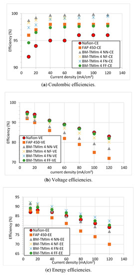 It is known that the VE (Figure 6b) is affected by the membrane’s ohmic resistance corresponding to its conductivity [33]. Nafion showed higher VEs than the AEBMs due to its high conductivity. It can be seen that the VE decreased with increasing current density due to increasing ohmic losses. For AEBMs, even though they have similar conductivities, the thinner membranes (BM-TMIm 4 FF) showed a higher VE than the thicker membranes due to the higher area resistance of the thicker membranes. The AEBMs possessed similar conductivities. Thus thicker membranes have a higher area resistance resulting in lower VEs as was expected [34]. The EE (overall efficiency—Figure 6c) of BM-TMIm 4 FN, BM-TMIm 4 FF and BM-TMIm 4 NF was slightly higher than that of the Nafion membrane due to the higher CEs (VEs were similar) at all current densities. These results confirm that the manufactured AEBMs are promising candidates for VRFBs.