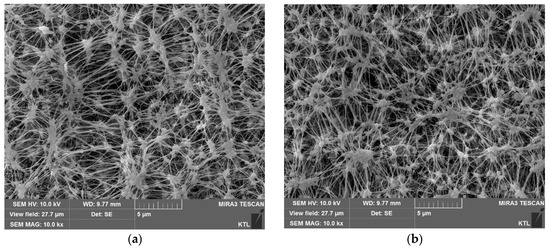 The surfaces of the PVDF and PTFE membranes were also examined using SEM as illustrated in Figure 6. It is evident from these images that the size of surface pores was reduced by applying the pressure. For example, Figure 6a,b are the SEM images for the unpressurized and pressurized PVDF membranes (FGLP). As demonstrated, the pores were shrunk after applying the pressure. Similar results were observed for Figure 6c,d (HVHP), Figure 6e,f (FGLP), and Figure 6g,h (FHLP). These also imply that the membranes were deformed under the pressurized conditions.