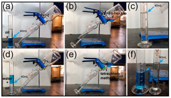 Photographs of the oil-water separation process: (a) a membrane fixed between a glass tube and a conical flask with a tilt angle of 45°, (b) a mixture of n-hexane (40 mL) and water (40 mL) poured into an upper glass tube and n-hexane passing through the membrane but water repelled, (c) hexane collected in a measuring cylinder after separation, (d–f) a similar process for separating tetrachloromethane (heavier than water) and water (water dyed with methyl blue). Adopted from Ref. [122].