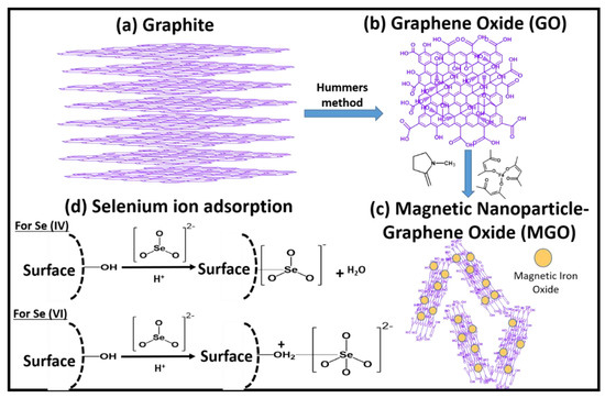 Magnetic graphene oxide (MGO-Fe3O4-GO) functionalized with xanthate exhibits ideal behavior as an adsorbent for the removal of Hg(II) with a high capacity of 118.55 mg/g for Hg2+ in 180 mm at neutral pH. Thermodynamic results indicated that adsorption was an endothermic and spontaneous process. The Major reason for the high selectivity was due to the specific surface area of graphene and the active xanthate groups [100]. Reduced graphene oxide (RGO)-metal/metal oxide, e.g., MnO2/Ag were prepared by simple synthetic methods by Sreeprasad et al. [101], and tested for the removal of Hg(II). Walnut shell-derived activated carbon (AC) was studied in an attempt to remove Hg(II) from industrial liquid streams [102]. AC has shown about 0.45 g/cm3 density, 737 mg/g iodine, and 780 m2/g Brunauer-Emmett-Teller (BET) surface area as its material property, with a decrease in Hg (II) uptake with an increase in pH. A magnetic graphene oxide (MGO), synthesized by Jin et al., showed a maximum sorption up to 91.29 mg/g in a Cd(II) methylene blue binary system. Tap water samples showed a sorption capacity of 65.39% Cd(II) [103]. Functionalized MGO composites were employed in the removal of selenium ions, which are toxic at concentrations >40 ppb (40 µg/L) (Scheme 2). The presence of MGO (1 g/L) demonstrated a removal efficiency of 80% for Se(VI), and >99.9% for Se(IV) from water at neutral pH [104].