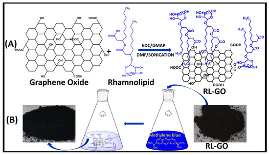 Schematic depiction of the formation of rhamnolipid-functionalized graphene oxide (RL-GO), and its application for the removal of MB. Adopted from Ref. [115]. (A) Chemical reaction occurred between GO and RL; (B) Pictorial representation of the products.