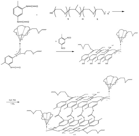 Previous works [45,46,47,48] have described microporous polymers and determined that the specific characteristics of the supramolecular structure of the former are due to the polyisocyanate blocks of acetal nature (O-polyisocyanates) as a rigid chain component. Figure 1 shows the scheme for obtaining such polymers. This scheme is based on the polyaddition reaction of 2,4-toluene diisocyanate (TDI) activated by the macroinitiator (MI), which is basically a potassium-substituted block copolymer of propylene and ethylene oxide (PPEG).