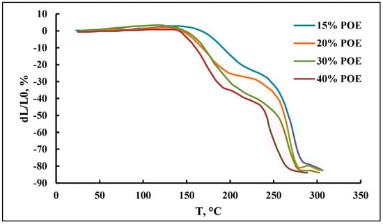 The curves of thermomechanical analysis (Figure 5) reflect the complexity of the macromolecular and supramolecular organization of the polymers that are being studied. Indeed, the question is about the block copolymers of polyethers and O-polyisocyanates. In turn, the flexible chain (polyether) component represents the block copolymers of propylene and ethylene oxides. Therefore, several relaxation processes are observed on TMA curves, which are significantly influenced by the content of POE blocks in PPEG. With an increase in the weight percentage of POE blocks, a shift in the onset of deformation to a lower temperature region is observed. The observed changes in TMA curves confirm the conclusion that a decrease in the content of POE blocks leads to more rigid packaging of O-polyisocyanate blocks.
