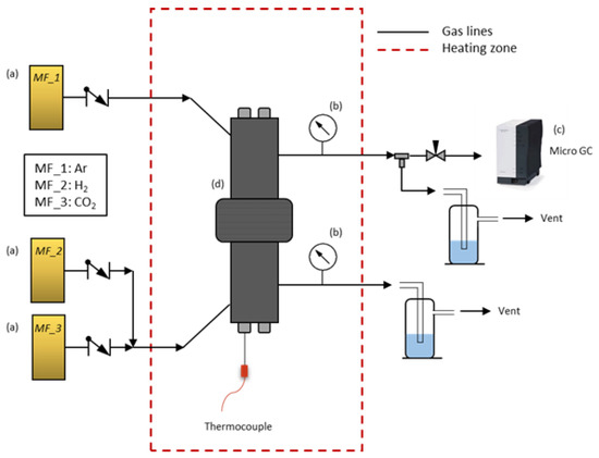 Single gas measurements at high temperature were performed in a module designed for this purpose. The set-up (Figure 2) consisted of: (a) three mass flow controllers (MF_1–MF_3) for H2 and CO2 as feed gases and Ar as sweep gas; (b) two manometers to control the internal pressure in both chambers of the reactor (feed side and permeate side); (c) a micro GC to measure the outlet gases at the permeate side; and finally (d) a reactor with two chambers that allow the membrane to be placed and sample to be sealed by rubber rings in the center. Membranes were placed in the center of the reactor and sealed from both sides. Hence, two well-defined chambers separated by the membrane sample allowed us to perform measurements at different temperatures.