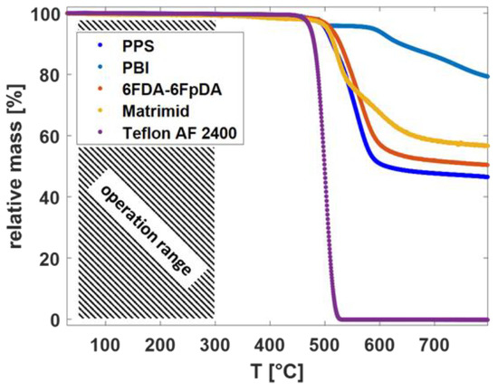 The glass transition temperature (Tg) was determined by DSC. The Tg of Matrimid® is 320 °C and the Tg of 6FDA-6FpDA is 310 °C, as reported in previous works [11,32]. The Tg of the PBI was 427 °C. These values clearly indicate the applicability of the chosen materials for application in the desired temperature range above 200 °C.