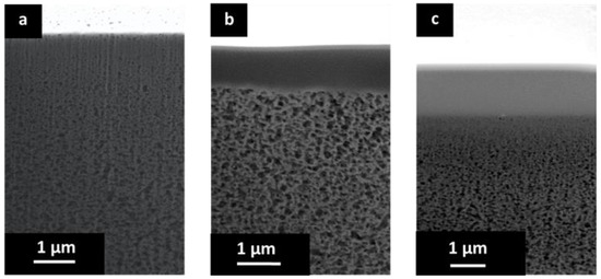 The cross-sectional morphology of the porous PBI and the prepared TFCMs was analyzed. The cross section of the porous support is presented in Figure 4 and Figure 5. In the lower part of Figure 4 the non-woven PPS fibers and the porous PBI layer on top can be seen. The porous PBI layer had a thickness of approximately l ≈ 30 μm, average pore size of about 100 nm, and a surface porosity of approximately 21%. The nitrogen permeance of the porous PBI was 459 mSTP3 m−2 h−1 bar−1, and the permeances of the other gases were in agreement with Knudsen-type gas flow through porous media.