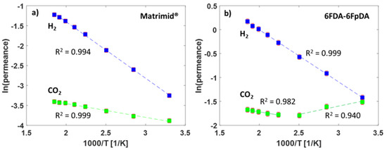 (a) Arrhenius plot for the TFCMs of Matrimid® and (b) 6FDA-6FpDA for temperatures between 30 and 266 °C.