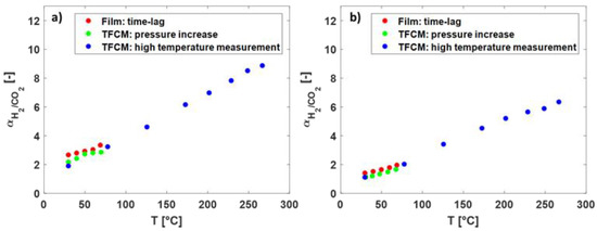 (a) The selectivity of H2/CO2 (-) over the temperature (°C) in Matrimid® and (b) in 6FDA-6FpDA for different membranes and measurement methods.
