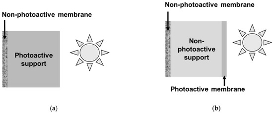 Photocatalytic membranes with ultraviolet (UV) irradiation on the permeate side; (a) intrinsically photoactive substrate, and (b) covering of the substrate grains with a photocatalytic coating or photoactive film deposited on the porous substrate.
