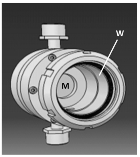 Membrane module especially designed for coupling photocatalysis and membrane filtration. (M) flat membrane; (W) window in borosilicate glass transparent to near-UV light.