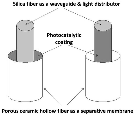 The design of compact modules with a large surface area of membrane is required. Optical fiber tissues have been recently developed [43]. They could be used as spacers and light distributors in spiral modules of photocatalytically functionalized organic membranes. On the other hand, the long-term degradation of the organic membranes under UV irradiation can be expected. Such drawback can be avoided using ceramic membranes. However, due their stiffness and brittleness, spiral modules cannot be obtained with ceramic membranes. One possible option would be the use of ceramic hollow fibers and of individual optical fibers as light distributors (Figure 6) [44]. Previous studies showed the feasibility of compact photocatalytic reactors using single optical fibers [45,46]. However, the manufacturing of such modules seems complex.