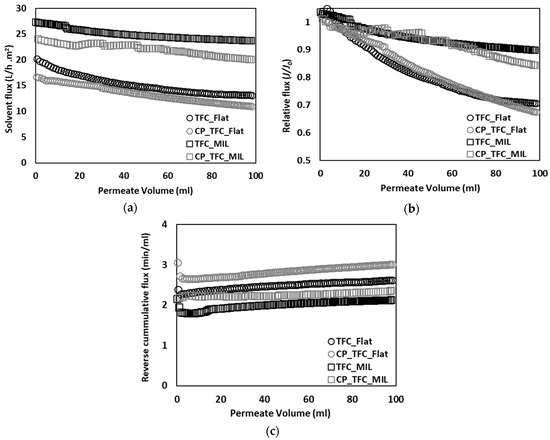 Figure 2a presents solvent flux decline plotted vs. permeate volume. The colloidal fouling rate of RO membranes in laminar or stagnant flow conditions was reported to be determined by an interplay between double-layer repulsion and permeation drag [5,11]. Micro-patterned membranes were usually found to enable filtration at higher permeate fluxes than flat membranes by virtue of increased membrane active surface area and enhanced membrane surface roughness [38,39]. As a result, colloidal fouling rate is implied to be dominated by high permeation drag and surface micro-structures [8]. Moreover, TFC_MIL and CP_TFC_MIL (see Table 2) exhibited solvent flux declines of 12.8% and 15.7%, respectively, whereas TFC_Flat and CP_TFC_Flat (see Table 2) showed solvent flux declines of 33.5% and 33.6%, respectively. Consequently, the patterned membranes showed noticeably lower flux reduction compared to their flat counterparts. Nevertheless, surface modified membranes were found to have lower solvent fluxes and slightly higher fouling propensity than pristine membranes.