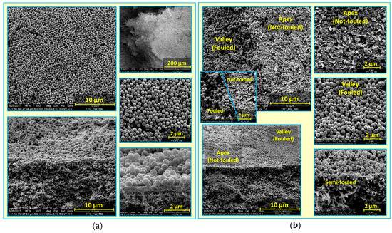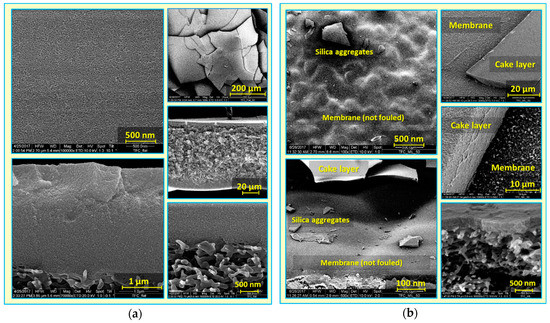 Furthermore, relative flux decline was plotted vs. permeate volume (see Figure 6b). Notwithstanding high initial fluxes, a delay in the onset of fouling, accompanied by a lower extent of fouling, was clearly seen for micro-patterned membranes, in comparison with the flat ones. This could be attributed to extended membrane active surface area, as well as enhanced hydrodynamics, as a result of surface micro-patterning [41], which may influence packing of deposited silica nanoparticles [30,35]. Subsequently, dry, fouled, flat and micro-patterned pristine membranes were analyzed using SEM (see Figure 7). SEM micrographs captured at different membrane regions using different magnifications showed very irregular deposition of silica nanoparticles atop micro-patterned membranes, such that silica nanoparticles accumulated or aggregated at certain regions while keeping most of the micro-patterned membrane surface not fouled. In contrast, a homogeneous, crack-free, and thick (~3 µm) silica cake layer was found in the case of the fouled flat membrane. Heterogeneous feed flow distribution (i.e., different local fluxes, see Figure 5) and unequal shear stress in the case of micro-patterned surfaces are believed to influence deposition and subsequent packing of silica nanoparticles. Similar findings were reported for nanopatterned UF membranes during colloidal fouling experiments in cross-flow conditions [30,32]. Moreover, uneven shear stress could also account for the clearly visible cracks in the deposited silica cake layer atop the micro-patterned surfaces. It is worth mentioning that these cracks were also noticed during SEM analysis of some wet fouled membranes (Figure S3, Supplementary Materials), indicating that stress in the silica cake layer should be mainly related to the alteration in silica deposition behavior during the filtration process rather than the procedures for post-filtration analysis [41].