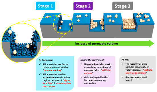 The influence of surface micro-structures on the particle deposition behavior was simulated and studied experimentally in cross-flow filtration mode, in particular for microfiltration (MF) and UF membranes [22,23,24,32]. Nevertheless, the outputs of these studies, along with the reported work on colloidal silica fouling of flat PA TFC membranes [5,8,11,26], can be specifically consolidated to interpret the significantly enhanced antifouling propensity of micro-patterned PA TFC membranes in unstirred dead-end filtrations. A mechanism is postulated based on filtration results and SEM analysis, with an illustration introduced in Figure 4 [41]. This mechanism comprises three stages.