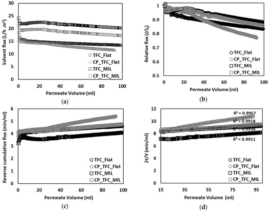 During data analysis, several relationships (see Reference [15]) were investigated, including solvent flux decline vs. permeate volume, relative flux decline (Equation (1)) vs. permeate volume, and reverse cumulative flux vs. permeate volume [41]. Furthermore, the applicability of the cake filtration mechanism (Equation (2)) was examined.